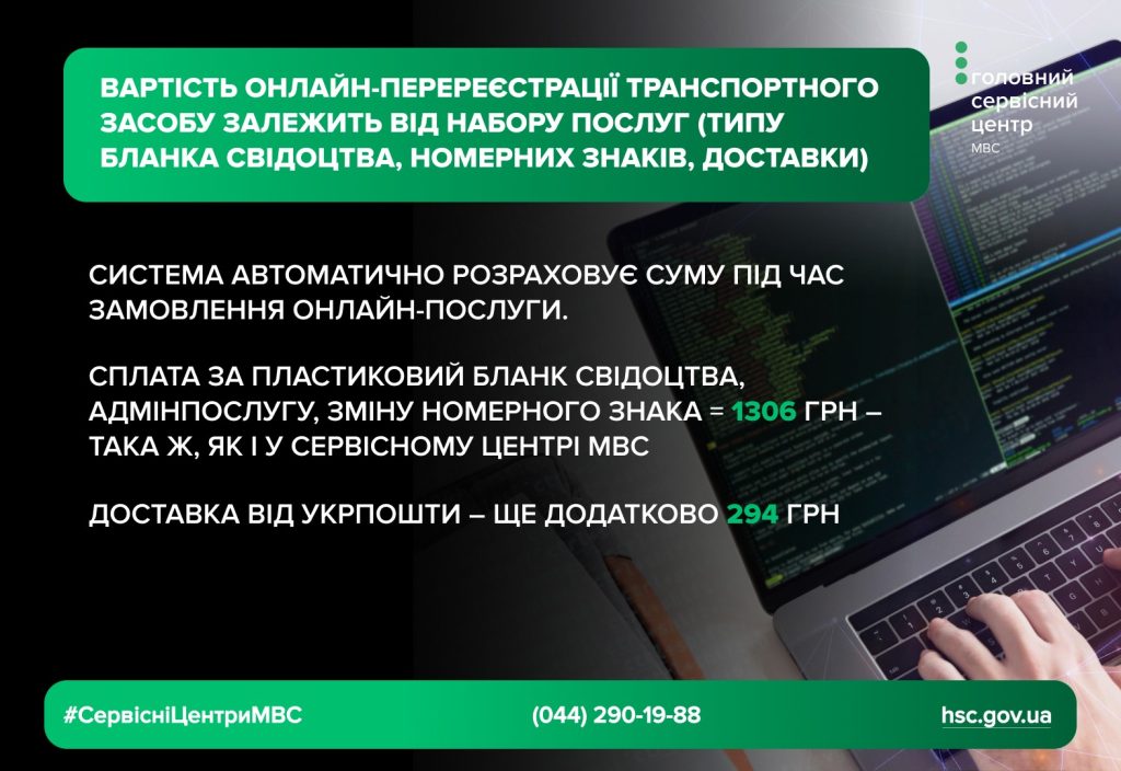Вартість: залежить від набору послуг (оформлення бланка свідоцтва, номерних знаків, доставки). Система автоматично розраховує суму під час замовлення. Але сплата за пластиковий бланк свідоцтва про реєстрацію транспортного засобу, адмінпослугу, метал номерних знаків залишається незмінною й такою ж як у сервісному центрі МВС – 1306 грн.