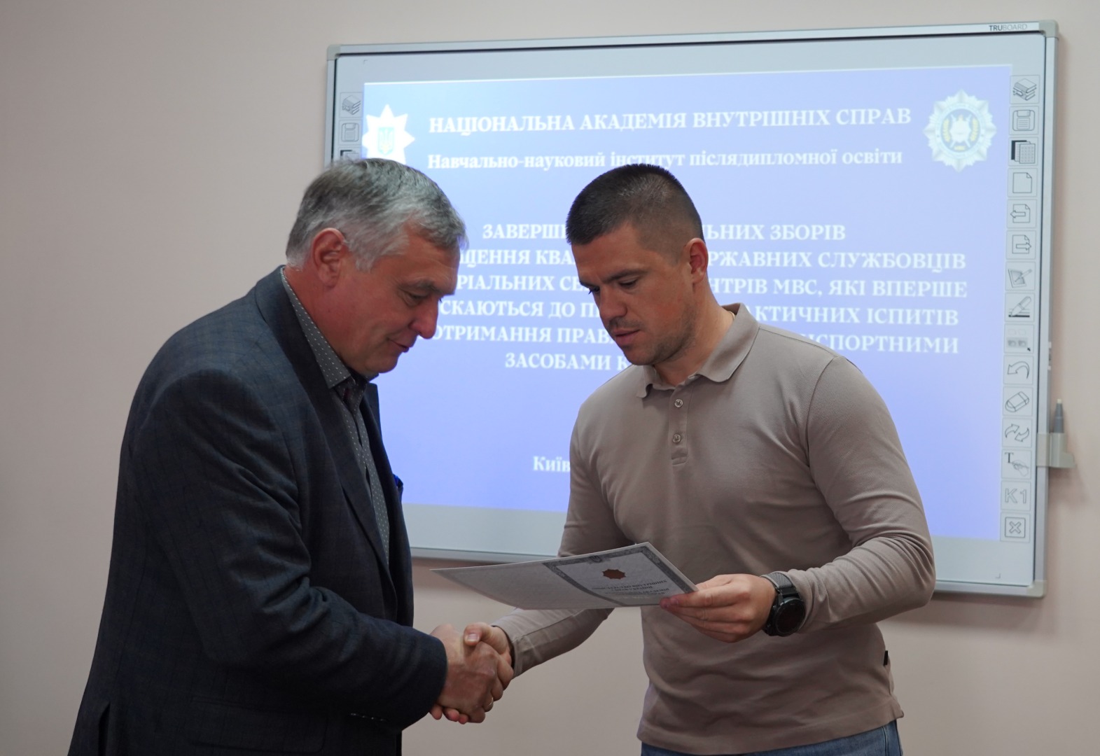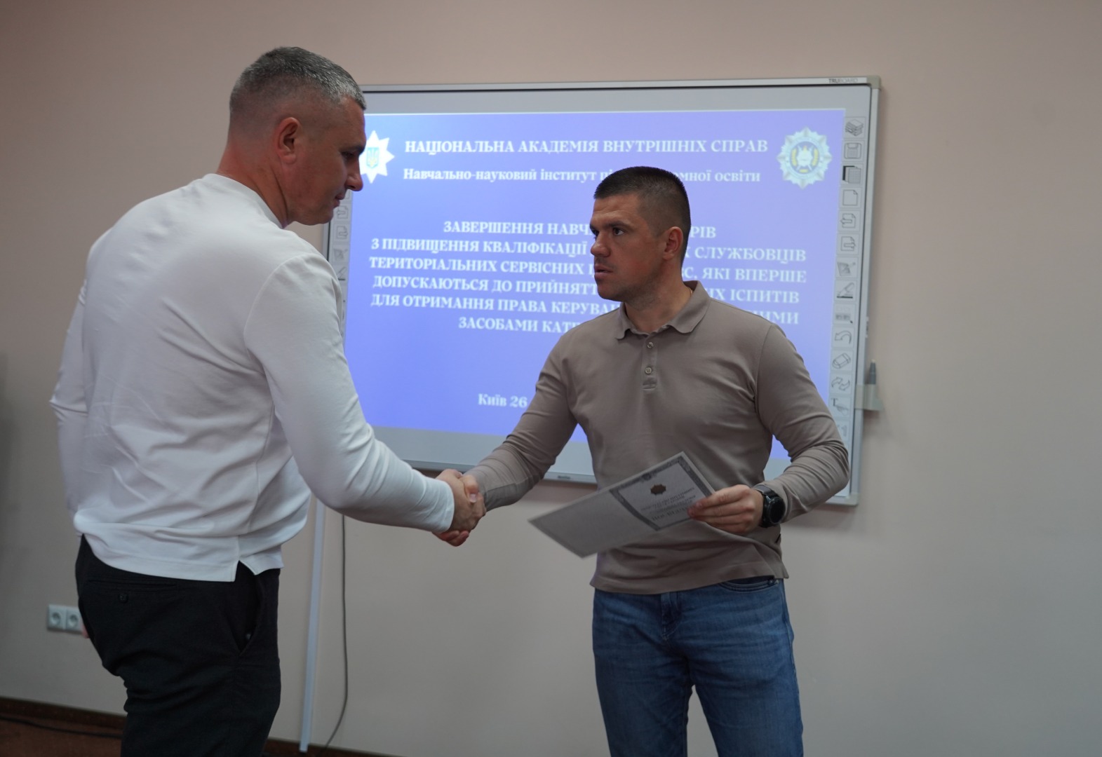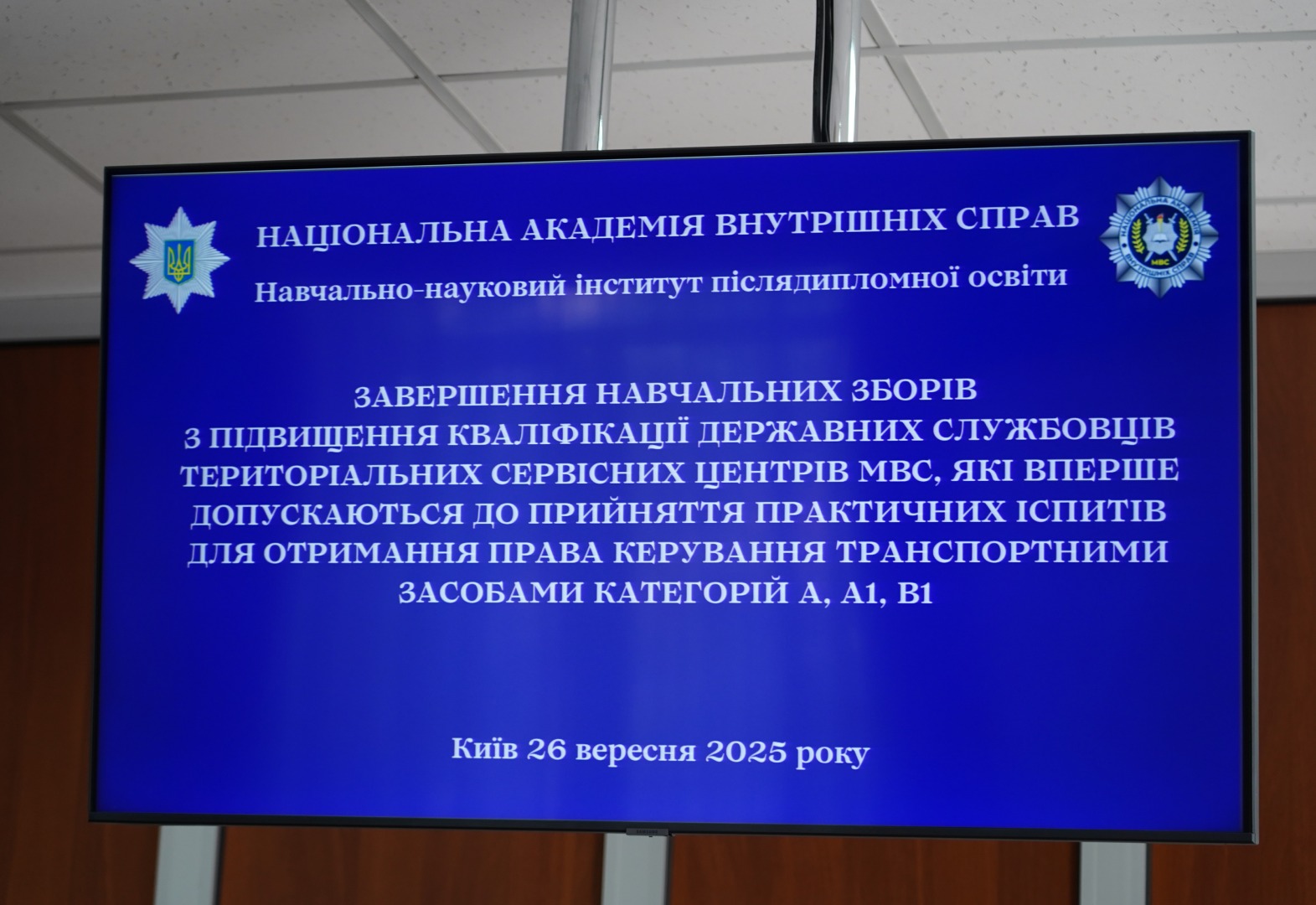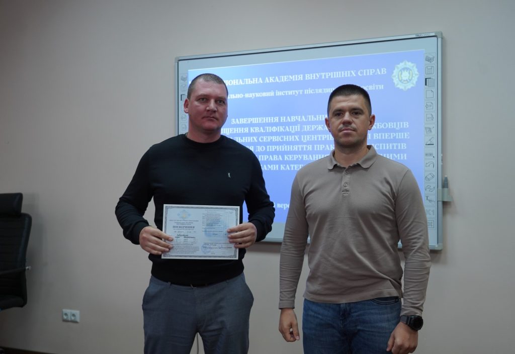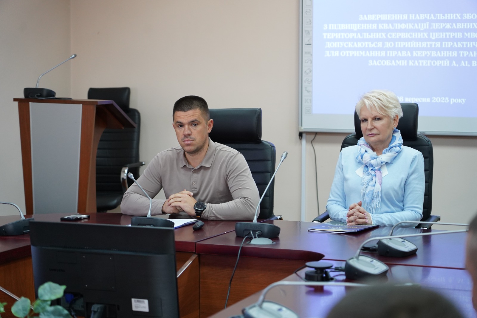 Цього разу 20 чинних екзаменаторів територіальних сервісних центрів МВС з 22 по 26 вересня проходили навчання за «Спеціальною професійною (сертифікатною) програмою підвищення кваліфікації державних службовців територіальних сервісних центрів МВС, які вперше допускаються до прийняття практичних іспитів для отримання права керування транспортними засобами категорій A, A1, B1». Усі вони отримали спеціальні посвідчення, які вручав перший заступник начальника Головного сервісного центру МВС Руслан Жук.
