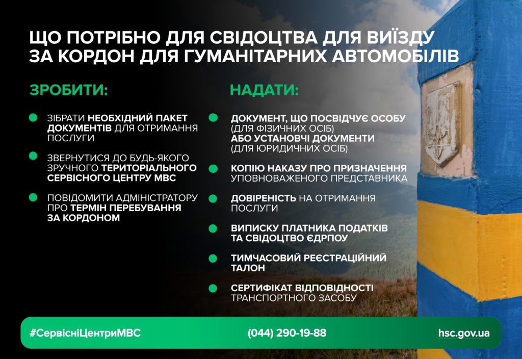 Свідоцтво про реєстрацію для поїздок за кордон таких транспортних засобів видається за умови подання до сервісного центру МВС сертифікату відповідності транспортного засобу та підтвердження митними органами інформації про оформлення декларації про перелік товарів, що визнаються гуманітарною допомогою. Відомості про оформлення декларації про перелік товарів, що визнаються гуманітарною допомогою, перевіряються шляхом надсилання сервісними центрами МВС запиту до митних органів.