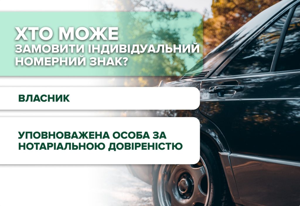 Замовити індивідуальний номерний знак може лише власник транспортного засобу або уповноважена особа за нотаріально засвідченою довіреністю. У довіреності обов’язково має бути зазначено, що особа уповноважена на замовлення та отримання індивідуального номерного знака, а також – на проведення перереєстрації транспортного засобу.