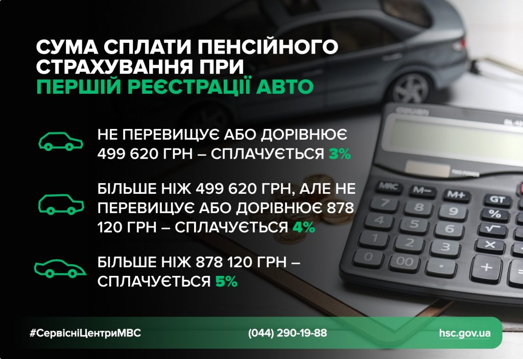 При першій державній реєстрації легкового автомобіля в Україні власник сплачує збір на державне пенсійне страхування. Цей платіж є одноразовим та обов’язковим як для нових транспортних засобів з автосалону, так і вживаних, що були ввезені з-за кордону.