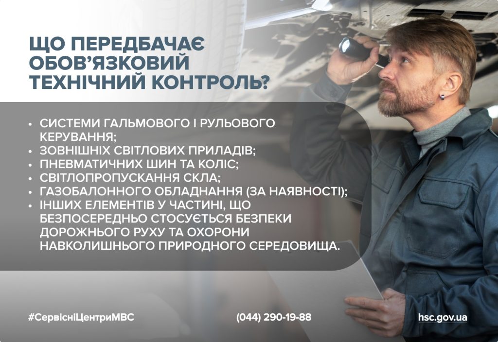 Обов’язковий технічний контроль транспортного засобу передбачає перевірку технічного стану транспортного засобу, а саме: