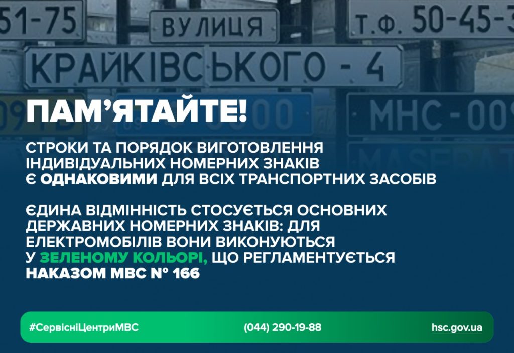 Власники як електромобілів, так і транспортних засобів з двигуном внутрішнього згоряння мають можливість замовити індивідуальні номерні знаки (ІНЗ). Порядок їх виготовлення та вимоги до напису визначені чинними нормативними актами МВС, і єдині для всіх типів транспортних засобів.