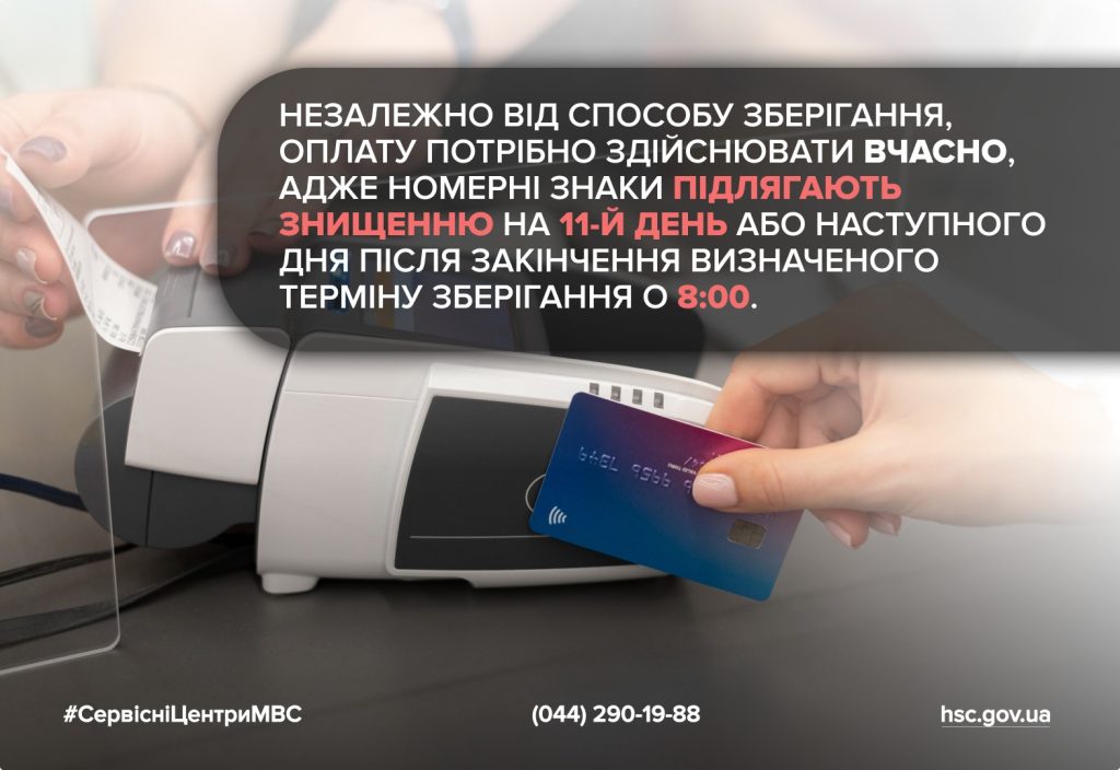 Нагадуємо, що незалежно від способу зберігання, оплату потрібно здійснювати вчасно, адже номерні знаки підлягають знищенню на 11-й день або наступного дня після закінчення визначеного терміну зберігання о 8:00.