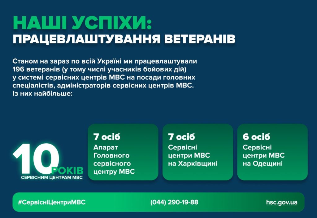 Станом на зараз по всій Україні ми працевлаштували 196 ветеранів (у тому числі учасників бойових дій) у системі сервісних центрів МВС на посади головних спеціалістів, адміністраторів сервісних центрів МВС. Із них найбільше: