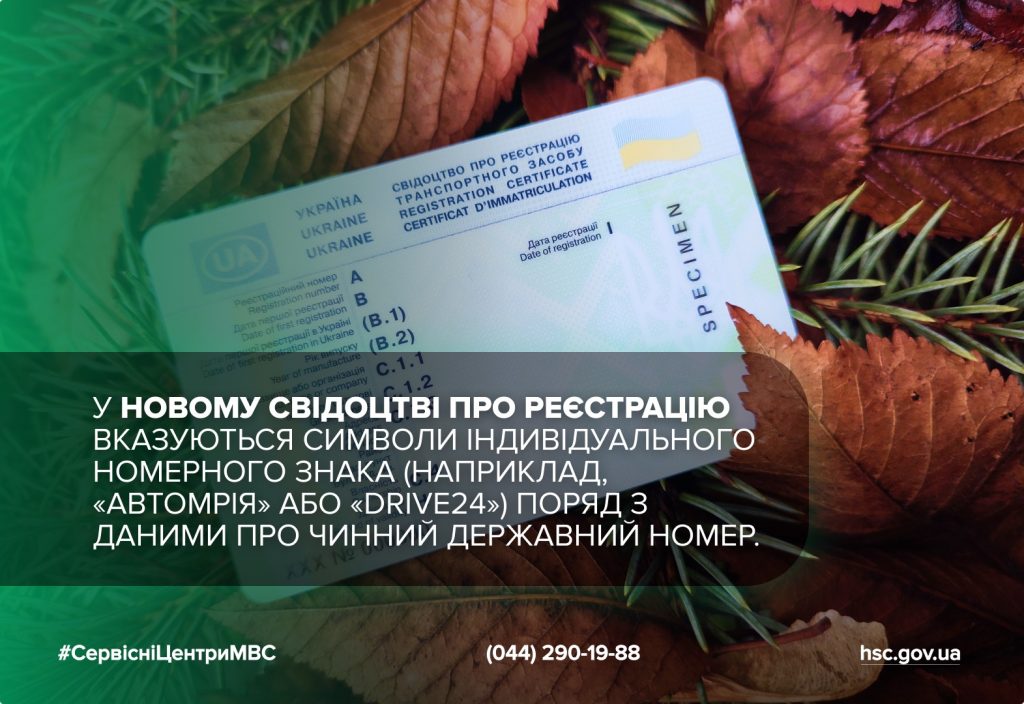 У сервісному центрі МВС здійснюється перевірка даних, після чого власнику видається нове свідоцтво про реєстрацію транспортного засобу. У новому свідоцтві про реєстрацію вказуються символи індивідуального номерного знака (наприклад, «АВТОМРІЯ» або «DRIVE24») поряд з даними про чинний державний номер. Це підтверджує, що обидва номери закріплені за одним транспортним засобом. Старе свідоцтво про реєстрацію при цьому вилучається.