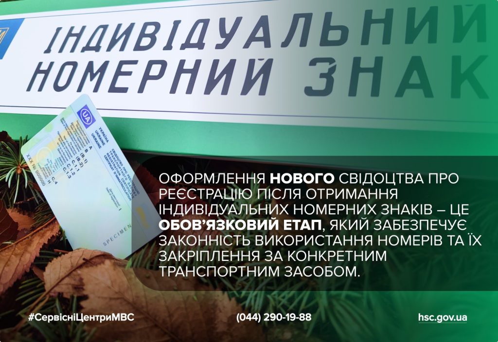 Після отримання індивідуальних номерних знаків власник транспортного засобу має звернутися сервісного центру МВС, в якому здійснюються реєстраційні діі для оформлення нового свідоцтва про реєстрацію транспортного засобу.