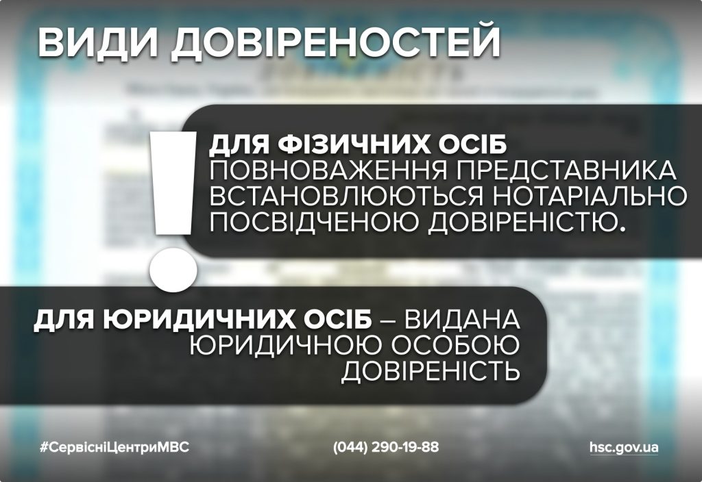Для фізичних осіб повноваження представника встановлюються нотаріально посвідченою довіреністю. Такий документ підтверджує право уповноваженої особи діяти від імені власника при отриманні послуг у сервісних центрах МВС.