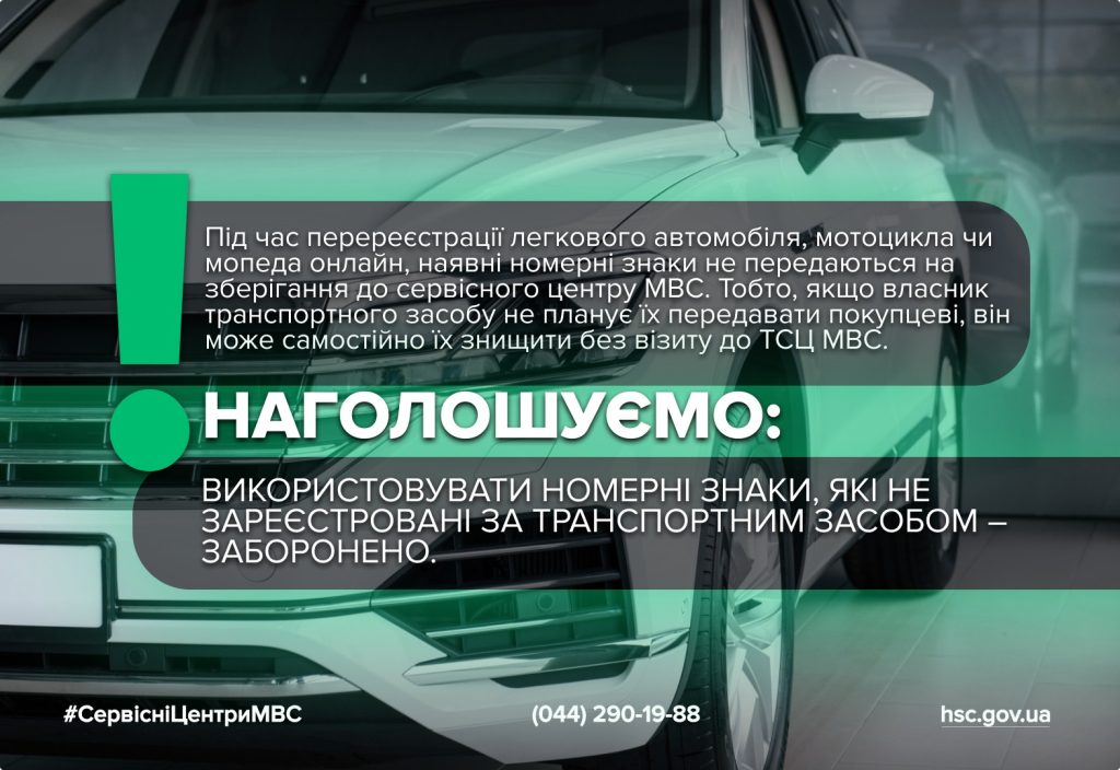 Ці дані свідчать, що більшість залишає номерні знаки на транспортному засобі, що продається. Однак в багатьох автовласників виникає питання – що робити із номерними знаками, якщо покупець замовив нові із серією DI. Пояснюємо: під час перереєстрації легкового автомобіля, мотоцикла чи мопеда онлайн, наявні номерні знаки не передаються на зберігання до сервісного центру МВС. Тобто, якщо власник транспортного засобу не планує їх передавати покупцеві, він може самостійно їх знищити без візиту до ТСЦ МВС.
