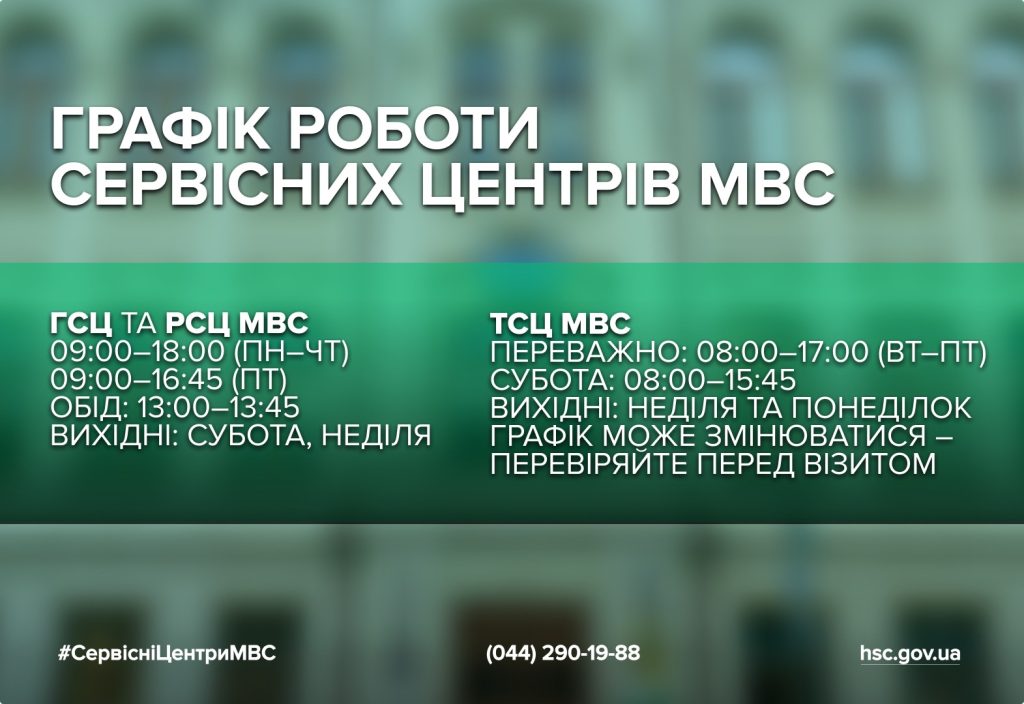 - Якщо ви плануєте звернутися до ГСЦ або РСЦ МВС – враховуйте їхній класичний офісний графік (9:00–18:00 у будні, з обідньою перервою).