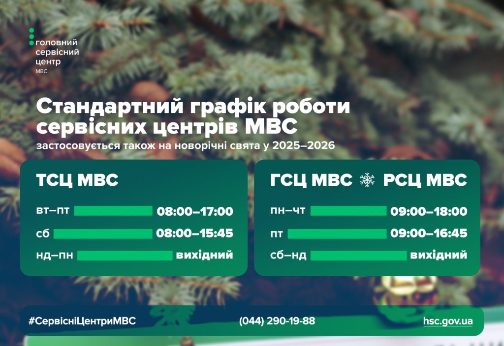 Через дію воєнного стану в Україні норми законодавства, що встановлюють святкові і додаткові вихідні дні, не застосовуються. Це означає, що в 2025–2026 роках навіть у такі дати, як 25 грудня та 1 січня, офіційно немає вихідних або неробочих днів для державних установ, зокрема для сервісних центрів МВС. Тож вони працюють у звичному режимі без змін, аби кожен громадянин міг своєчасно отримати необхідні послуги.
