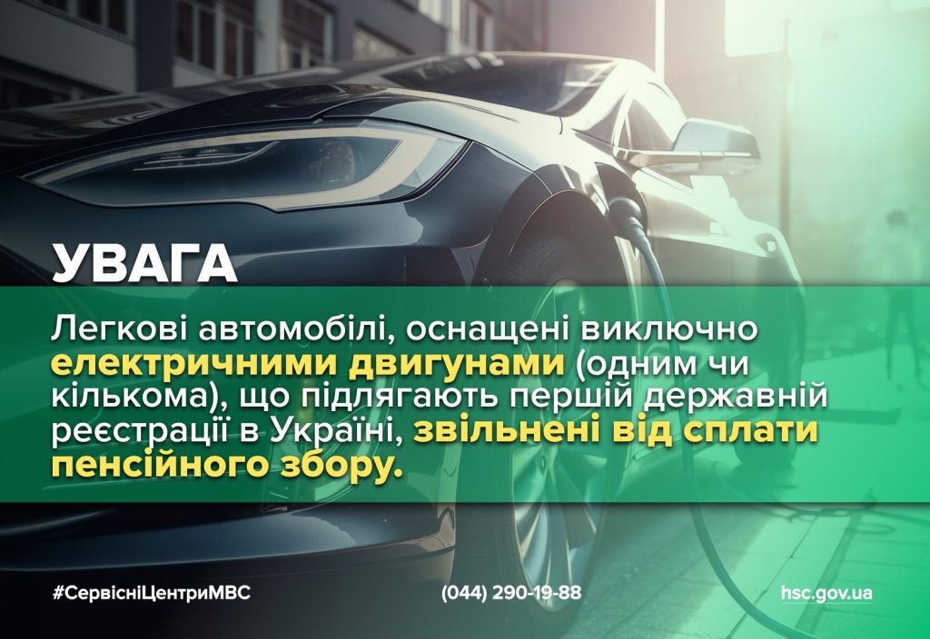 У Головному сервісному центрі МВС нагадують: під час першої державної реєстрації транспортних засобів, оснащених виключно електричними двигунами, пенсійний збір не сплачується. Відповідна норма залишається чинною та не зазнала змін.