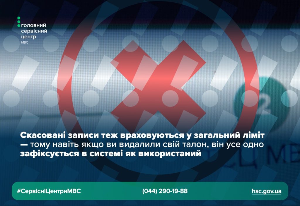 Скасовані записи теж враховуються у загальний ліміт — тому навіть якщо ви видалили свій талон, він усе одно зафіксується в системі як використаний.