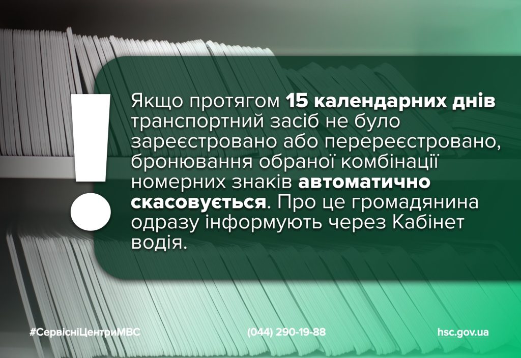 Якщо протягом 15 календарних днів транспортний засіб не було зареєстровано або перереєстровано, бронювання обраної комбінації номерних знаків автоматично скасовується. Про це громадянина одразу інформують через Кабінет водія.