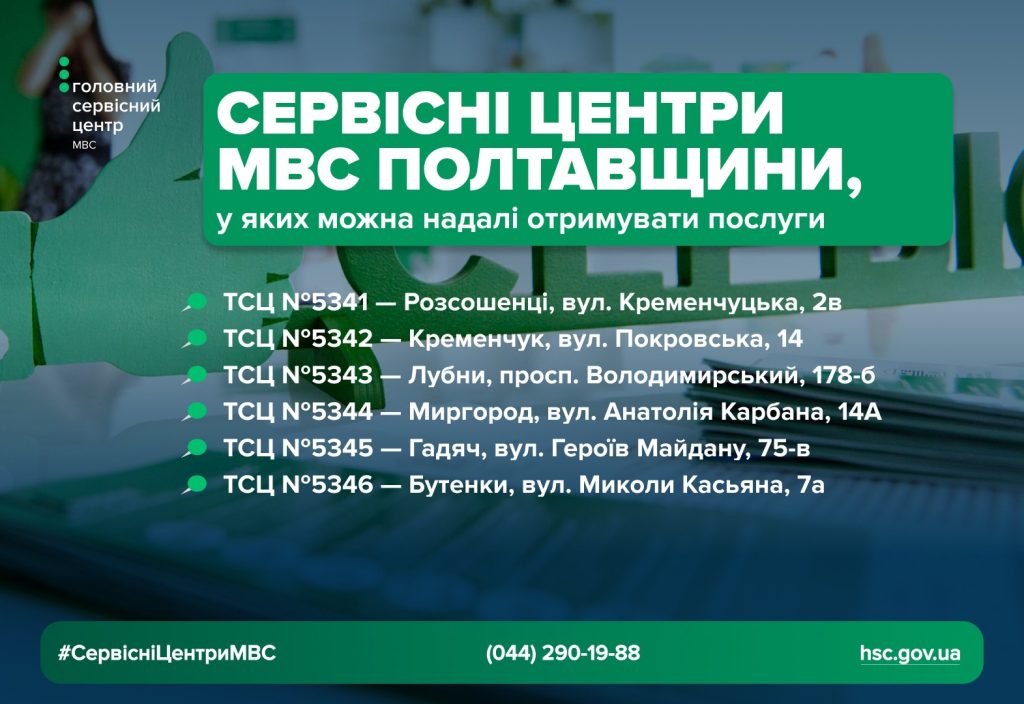 Надалі мешканці Полтавщини зможуть отримувати адміністративні послуги в інших сервісних центрах МВС області, зокрема: