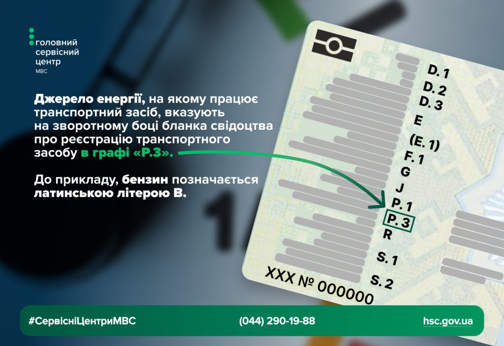 Джерело енергії,  на якому працює транспортний засіб  розміщуються на зворотному боці бланка свідоцтва про реєстрацію транспортного засобу в графі «P.3». До прикладу, бензин позначається латинською літерою – B.