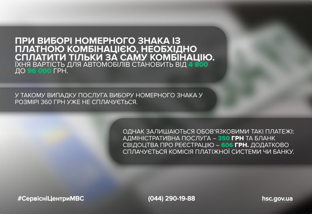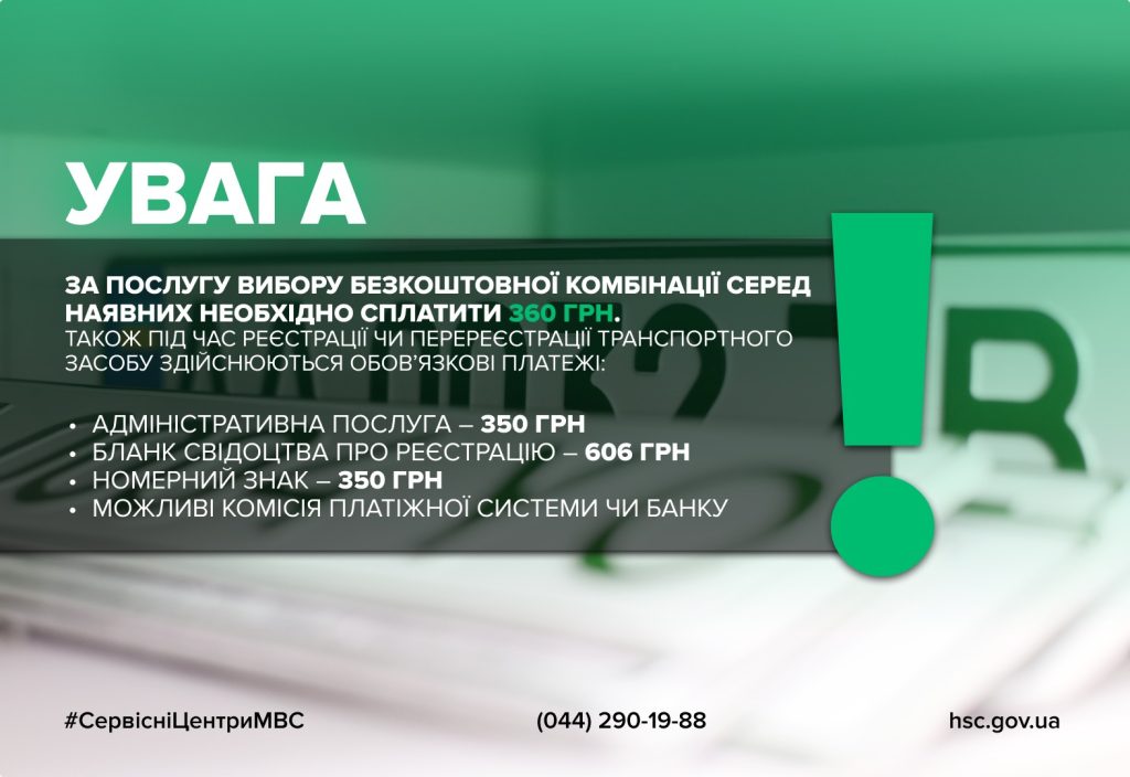 За послугу вибору безкоштовної комбінації серед наявних необхідно сплатити 360 грн. Також під час реєстрації чи перереєстрації транспортного засобу здійснюються обов’язкові платежі: