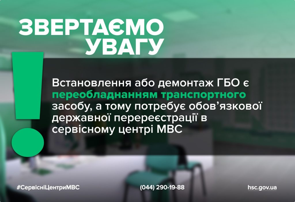 Головний сервісний центр МВС нагадує: встановлення або зняття ГБО є переобладнанням транспортного засобу, а отже потребує обов’язкової державної перереєстрації в сервісному центрі МВС.