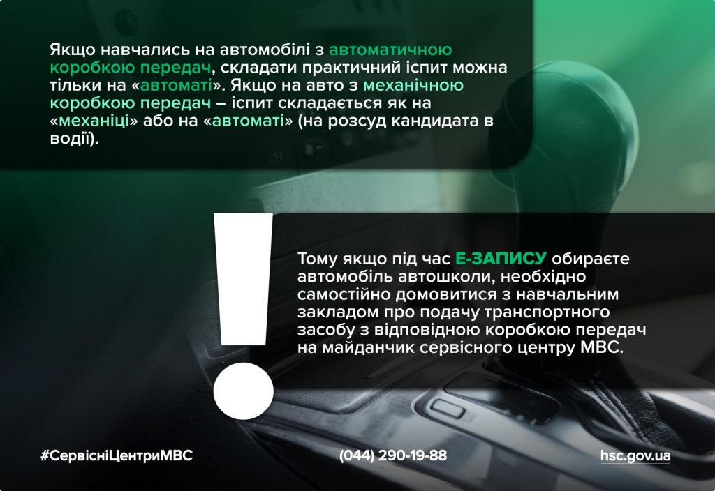 Під час запису на практичний іспит в сервісному центрі МВС на транспортному засобі автошколи – тип коробки передач у записі не зазначається.