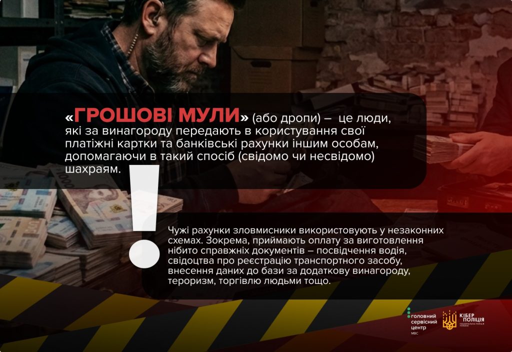 «Грошові мули» (або дропи) – це люди, які за винагороду передають в користування свої платіжні картки та банківські рахунки іншим особам, допомагаючи в такий спосіб (свідомо чи несвідомо) шахраям.