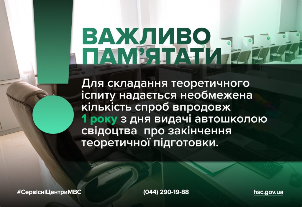 Звертаємо увагу, для складання теоретичного іспиту надається необмежена кількість спроб впродовж 1 року з дня видачі свідоцтва про закінчення теоретичної підготовки. У разі якщо особа не склала теоретичний іспит, наступний теоретичний іспит призначається не раніше ніж через десять календарних днів, що обраховуються, починаючи з наступного дня після складання теоретичного іспиту.