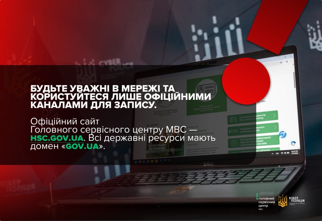Будьте уважні в мережі та користуйтеся лише офіційними каналами для запису.  Офіційний сайт Головного сервісного центру МВС — hsc.gov.ua. Всі державні ресурси мають домен «gov.ua».v