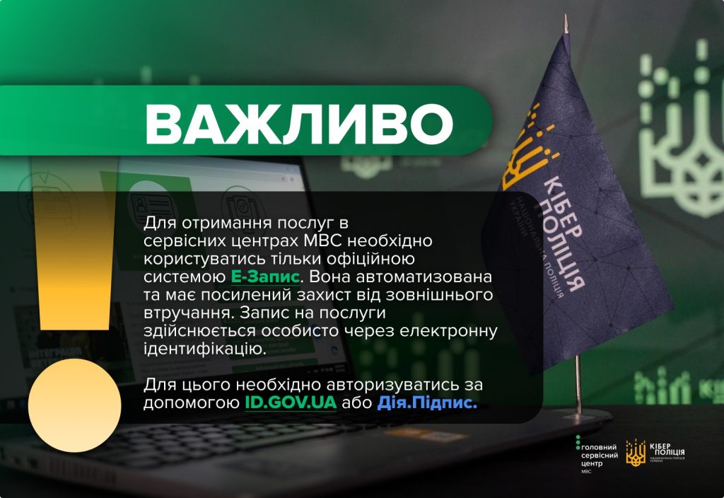 Для отримання послуг в сервісних центрах МВС необхідно користуватися лише офіційною системою Е-Запис. Вона автоматизована та має посилений захист від зовнішнього втручання. Запис на послуги здійснюється особисто через електронну ідентифікацію. Для цього необхідно авторизуватись за допомогою ID.GOV.UA або Дія.Підпис.