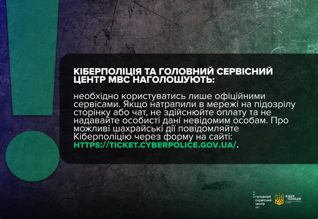Кіберполіція та Головний сервісний центр МВС наголошують: необхідно користуватись лише офіційними сервісами. Якщо натрапили в мережі на підозрілу сторінку або чат, не здійснюйте оплату та не надавайте особисті дані невідомим особам. Про можливі шахрайські дії повідомляйте Кіберполіцію через форму на сайті: https://ticket.cyberpolice.gov.ua/.